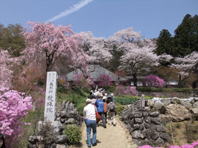 | ちょうど見頃を迎えた「花の寺・龍珠院」。青い空と白い雲にピンクの桜が引き立ちます。 |